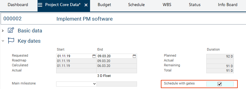 According to the calculated dates of the project, the portfolio manager sets the dates for the quality gates in the Date field and carries out the schedule calculation in the Schedule module.