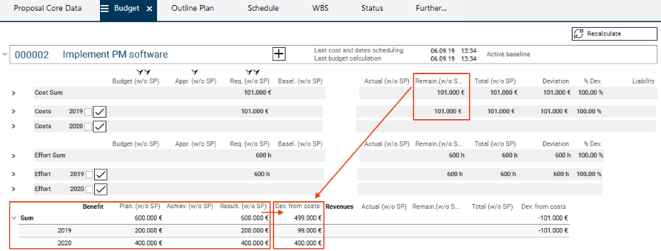 Wera Heine clicks on the Recalculate button. The figures from the Costs 2019 yearly tranche are summarized to project total level.