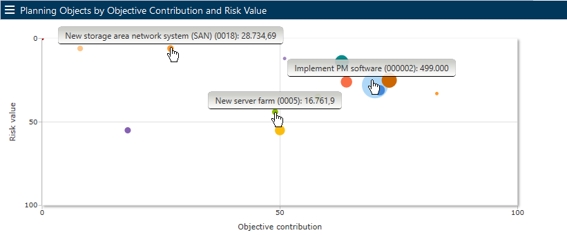 The visual comparison option helps the portfolio manager to quickly come to a decision on which ideas or proposals to cancel and which ones to turn into projects.