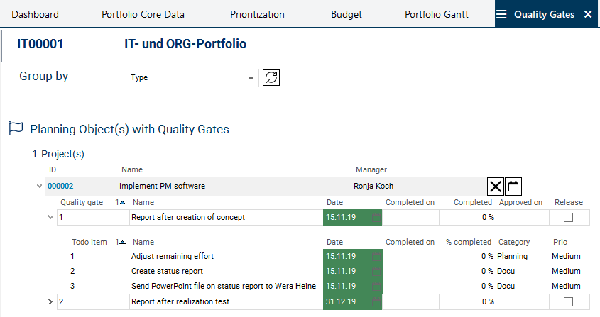 The dates of the todo items correspond to the dates of the quality gates and are calculated when applying the template to a particular project. The portfolio manager can change them manually afterwards.