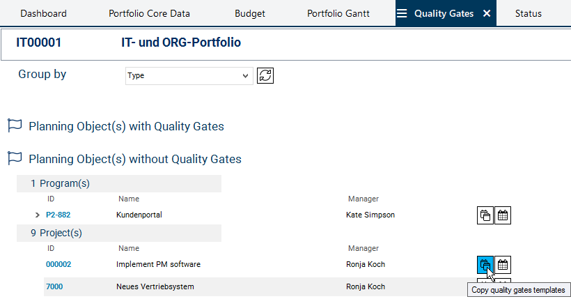 In the Quality Gate Templates module, templates are created which can be selected for individual portfolios and which then apply to all planning objects of these portfolios.