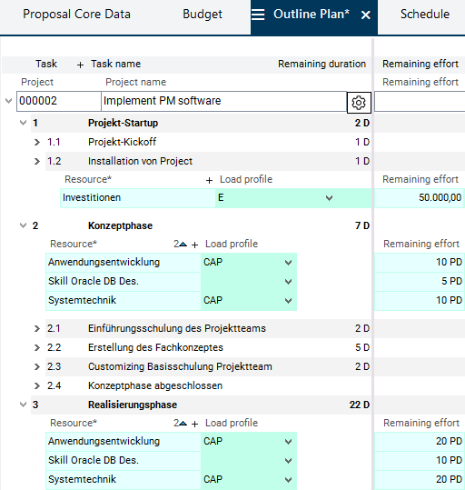 Master data, such as calendar, resources, users, hourly rates, etc. is already set up in the demo data. This tutorial does not cover the definition of master data (for information on this subject, see Master Data Entry). It is merely about how to integrate a new proposal in a portfolio addition to already existing ideas, proposals, and projects ones and showing the impact of this integration.