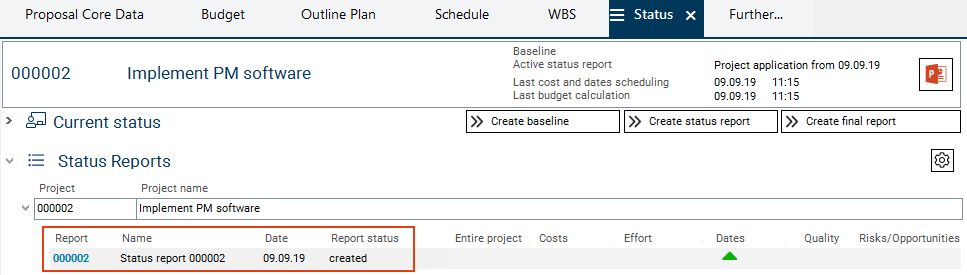 To freeze the current state of the Implement PM software proposal, she creates a status report and releases it.