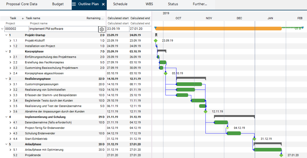 The portfolio manager wants to adjust the quality gate dates set in the template by default to those of the project. For this purpose, she wants to check the schedule of the Implement PM software project.