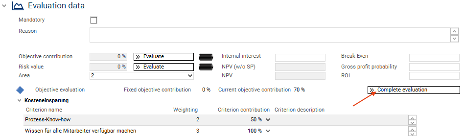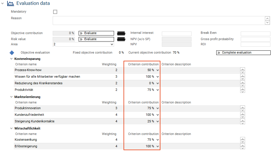 On the basis of this information, she wants to decide which proposals and ideas are profitable and can be realized as projects and which ones can possibly be removed from the portfolio or be set to inactive temporarily.