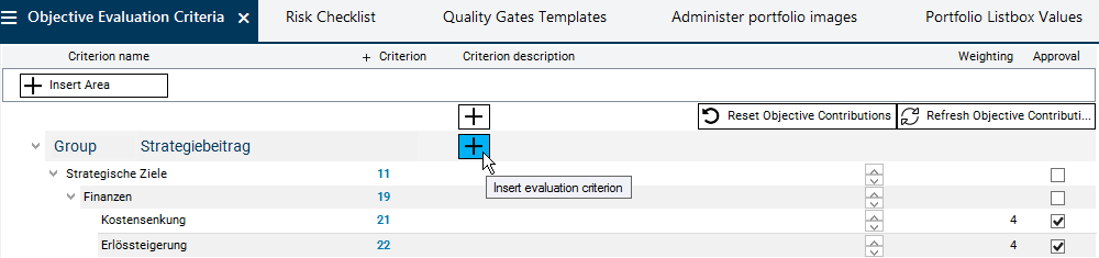 In this module, areas and groups are only selected in order to be used to outline objective evaluation criteria. The areas are created in the Portfolio Listbox Values module.
