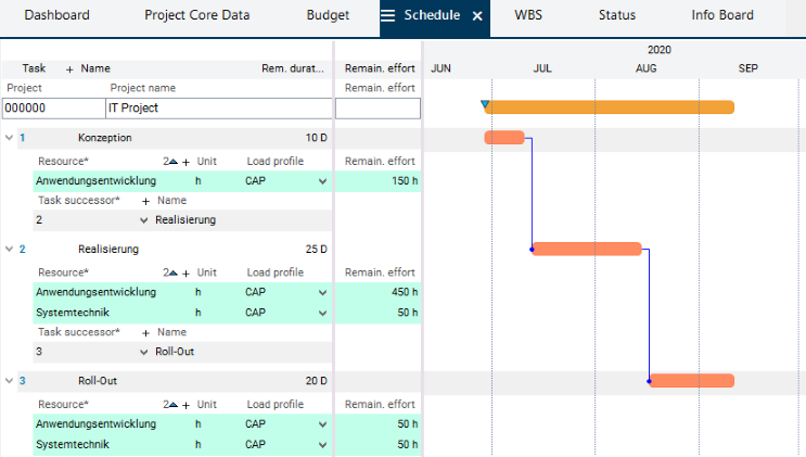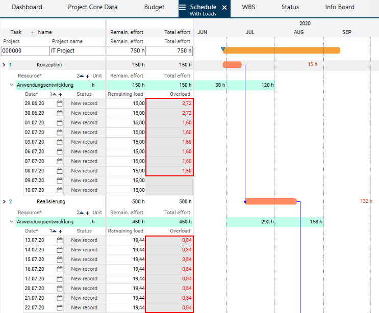 • Result: The dates are calculated, the planned effort is distributed over the planned duration and existing overloads are identified.