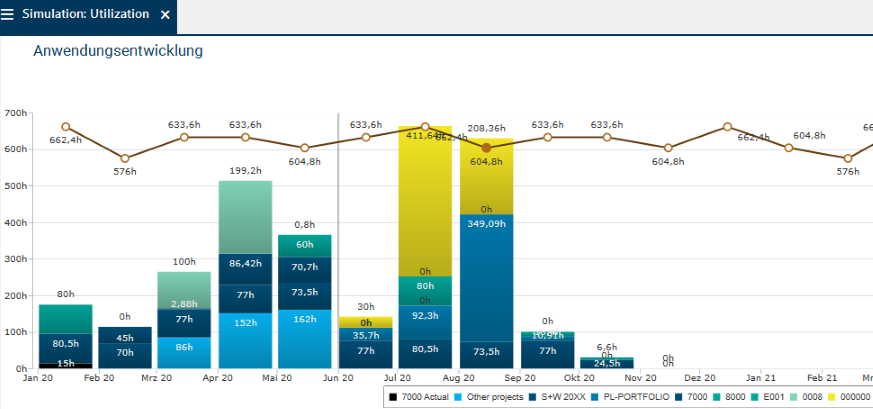 • With a simulation, different utilization and date scenarios can be simulated in order to be able to implement the projects of the portfolio with optimized utilization of the resources.