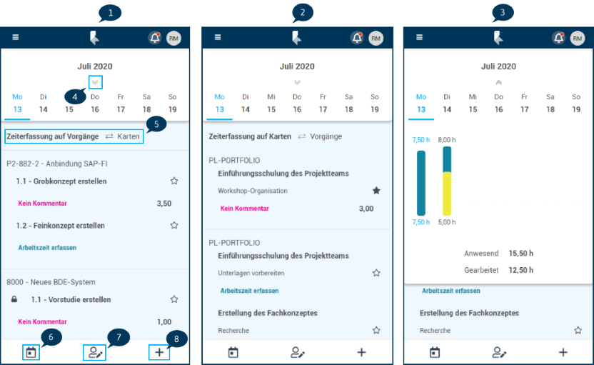 Here, only PLANTA pulse cards in which the logged-on user is planned or on which the user has already recorded hours are displayed.