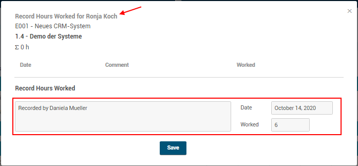 • In the dialog window, a note is displayed which specifies for whom the hours worked are recorded.