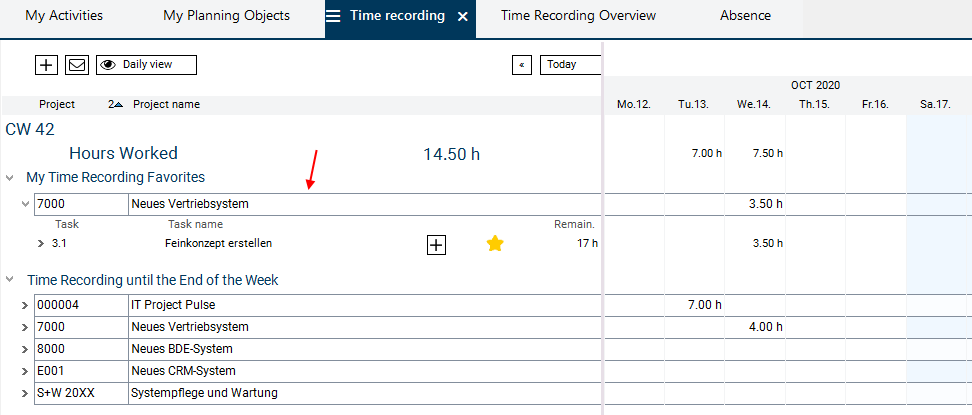 • Daniela Mueller noticed that she has made a mistake in today’s time recording: She has recorded 3.5 hours on task 3.1 Feinkonzept erstellen ("Create detailed concept") in project "7000" while she has only worked on this task for 3 hours.
