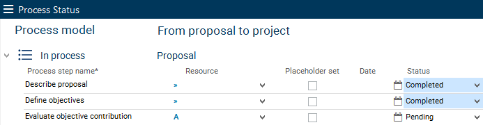 You can select a status from the listbox for each process step.