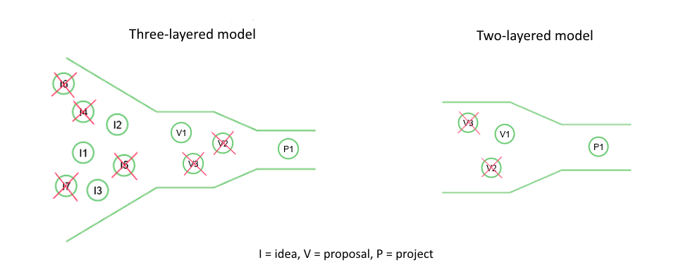 In the three-layered model, rough project ideas are collected that are then substantiated to proposals which are eventually converted to promising projects.