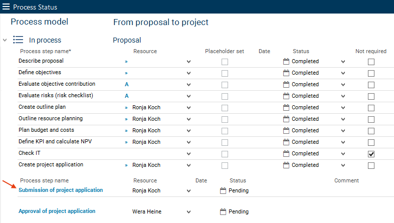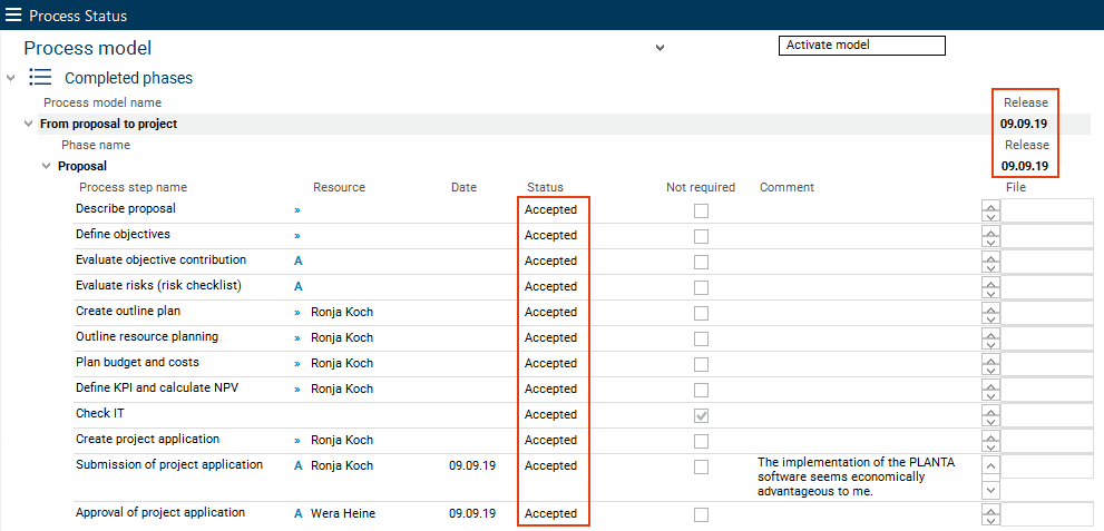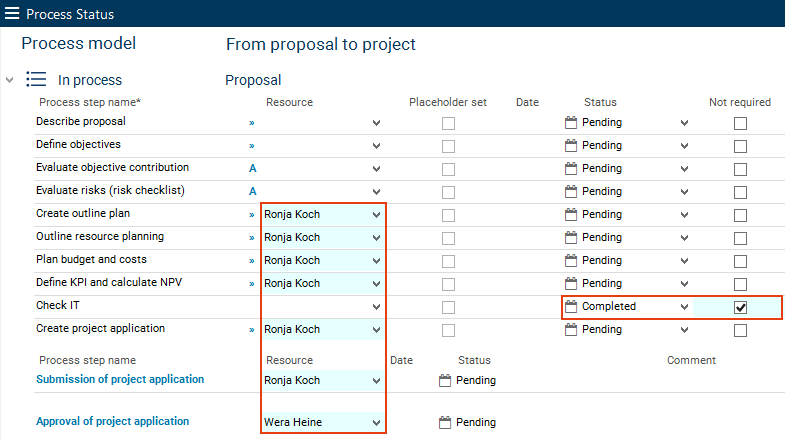 In the course of this, the status of all process steps is changed to "accepted" and in the Approval field, the date of approval by portfolio manager Wera Heine is displayed.