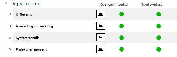 By means of the red traffic light in the Overload in period and Total overload columns in the Departments area, Wera Heine immediately sees that there is a resource overload in the Systemtechnik ("System Technology") department in the current planning situation.