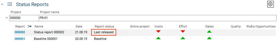 Click on the number of the required status report. The data of the report is displayed next to the current data of the project and can be compared.