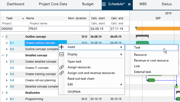 In the Schedule module, right-click on the Create outline concept task and select Insert → Task from the context menu.