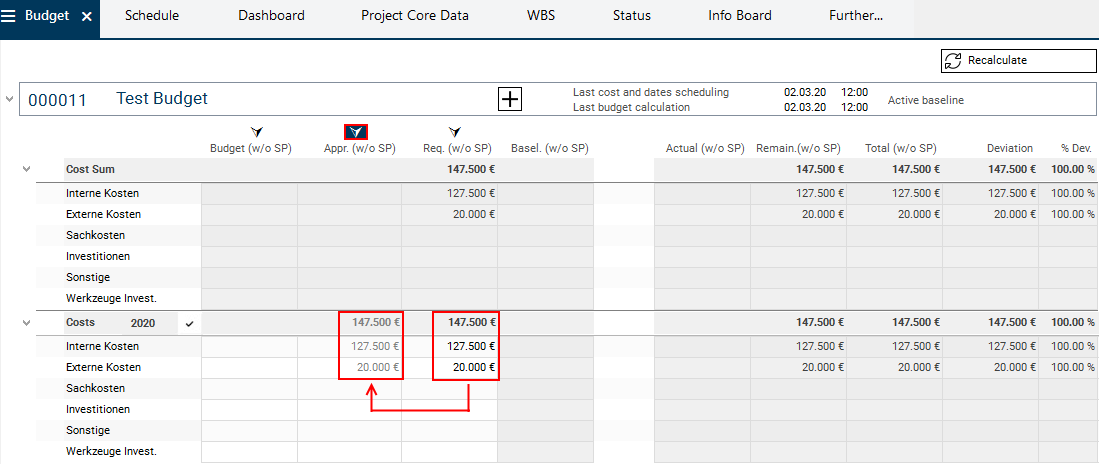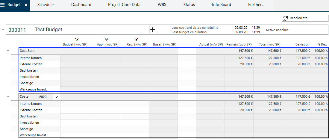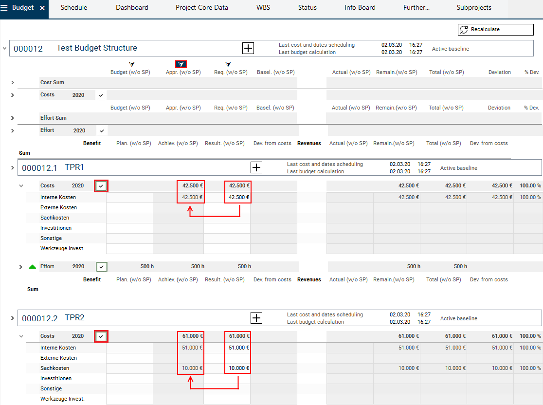 As soon as the subprojects have been budgeted (the Budget (w/o SP) column in the subprojects has been filled) and the Recalculate button has been clicked on, the budget values will be summed up along the project structure.