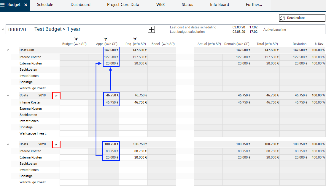Subsequently, he/she clicks on the Recalculate button. The values are now summarized from yearly tranche to project level.