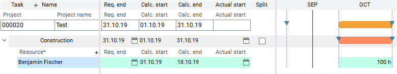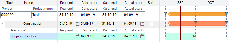 Resource Benjamin Fischer has reported 5 hours of work to the Construction task. The task is not split. After calculating the schedule, the following situation arises: