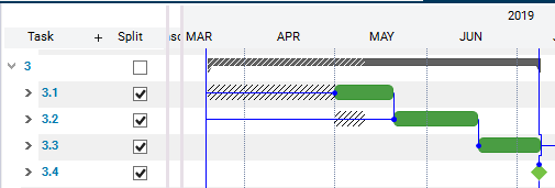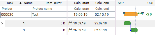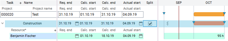 Work on this task is not to be continued but scheduled for a later point in time. By setting Split = , the rest of the task will be planned according to the network plan. It is also removed by requested dates.