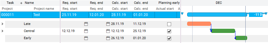 They take priority over the Planning early parameter, which means that the task is loaded with adherence to schedule and total float. In the case of planning with adherence to capacity with load profile CAP, the task may be extended if there is an overload.