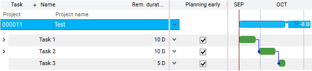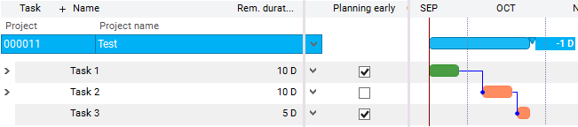 Planning early parameter has no effect on a summary task. The summary tasks receive their dates from the child tasks. On child tasks, the Planning early parameter has the same effect as on unstructured tasks. If the child tasks have both Planning early = as well as Planning early = , the Calculated start receives the Earliest start of all child tasks from the summary task and the Calculated end receives the Latest end of all child tasks from the summary task.