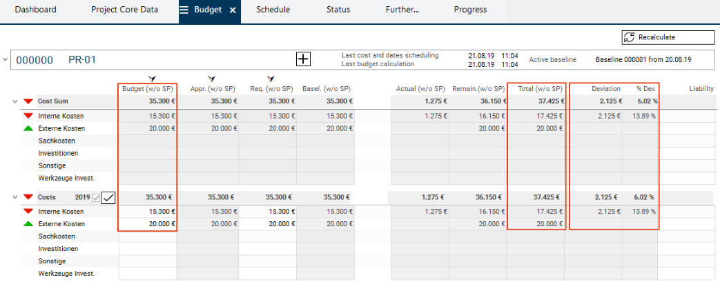 The multi-project manager clicks on the checkmark next to the Costs heading to approve the budget. Subsequently, he/she clicks on the Recalculate button.
