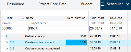 Enter the planned duration (e.g. 10 for 10 days) in the Remaining duration field in the Schedule module of the Create outline concept task.