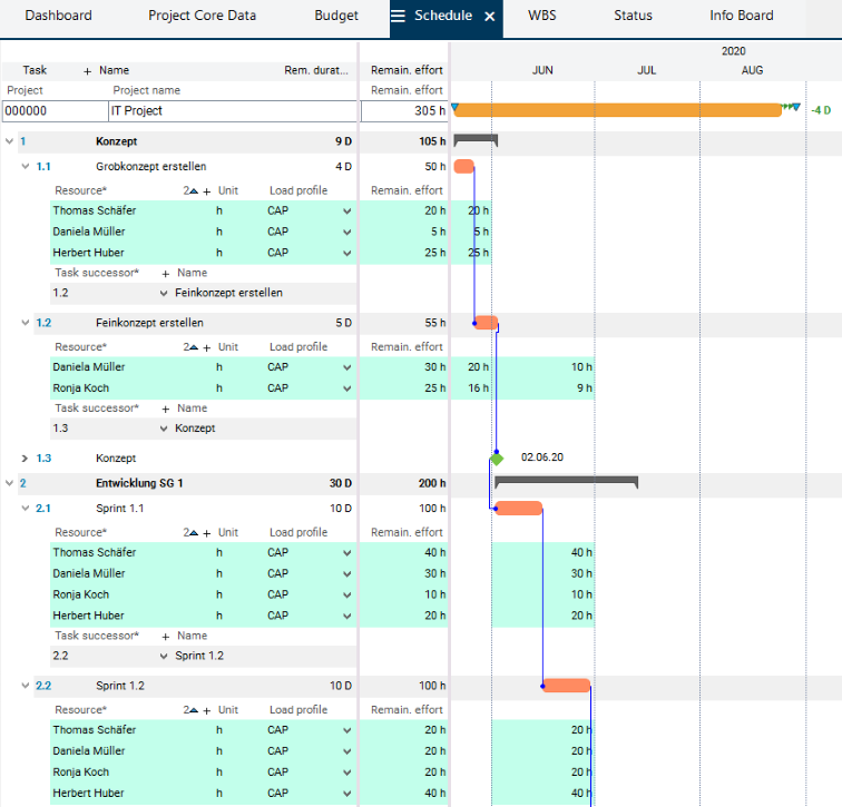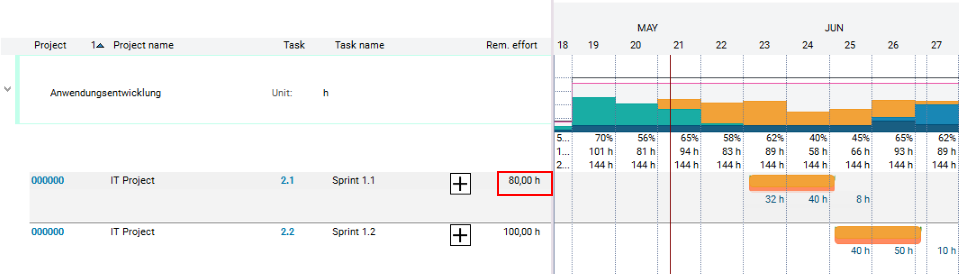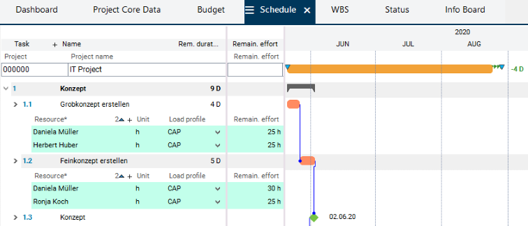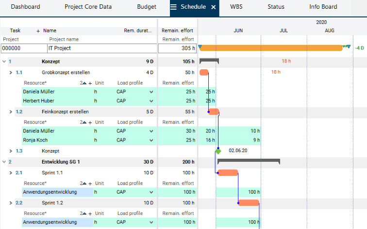 Result: The dates are calculated, the planned effort is distributed over the planned duration and existing overloads are identified.