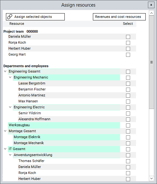 Activate the checkboxes of the resource entries for Daniela Mueller and Herbert Huber.