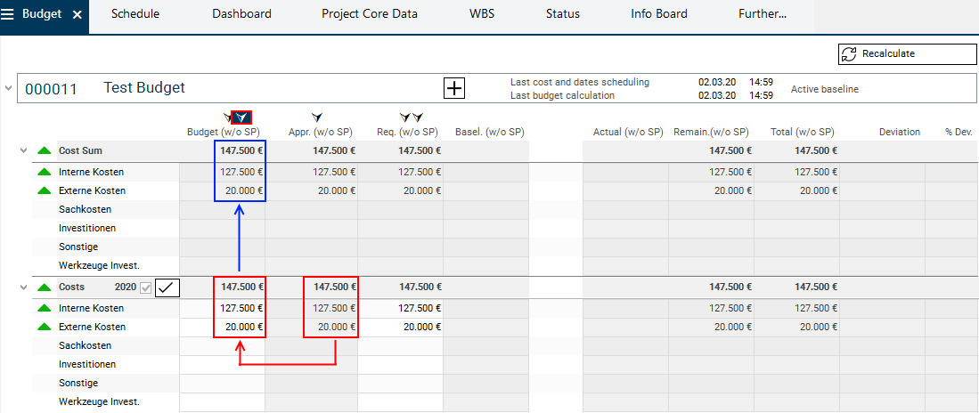 • As soon as the subprojects have been budgeted (the Budget (w/o SP) column in the subprojects has been filled) and the Recalculate button has been clicked on, the budget values will be summed up along the project structure.