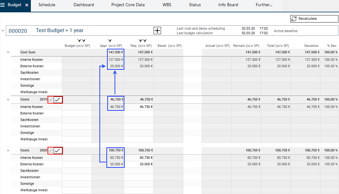 • Subsequently, he/she clicks on the Recalculate button. The values are now summarized from yearly tranche to project level.