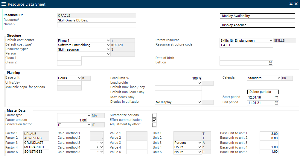 In addition, a skill resource of the same name which has no availability of its own but possesses periods on which can be loaded is created in the Resource Data Sheet module.