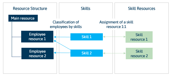 Skills can be assigned to employee resources in order to identify which employees have a particular qualification (=skill).