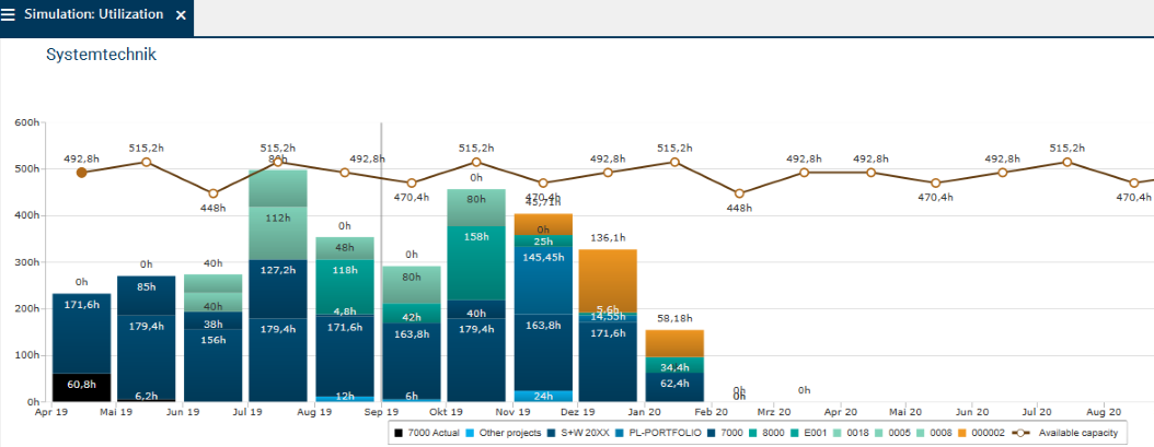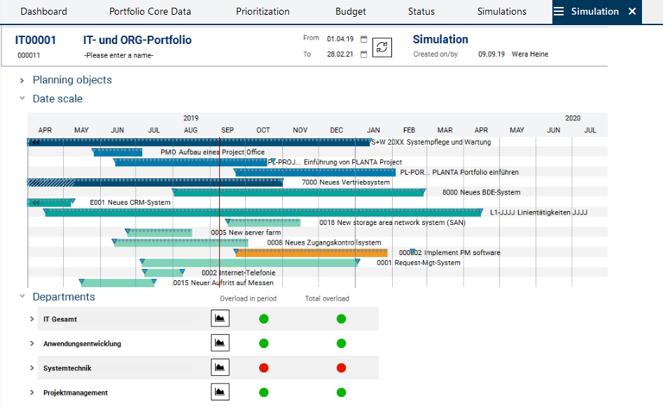 By the color display of the planning objects by code, the portfolio manager can immediately tell which planning objects cause the Overload. It is primarily the new proposal the code color of which is "orange".