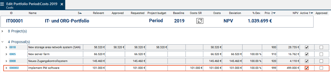 In the Proposal area, she deactivates the Active checkbox of proposals 0005 and 0018. As a result, the budget reserved for these proposals is no longer considered in the portfolio, i.e. the Relevant budget is reduced.