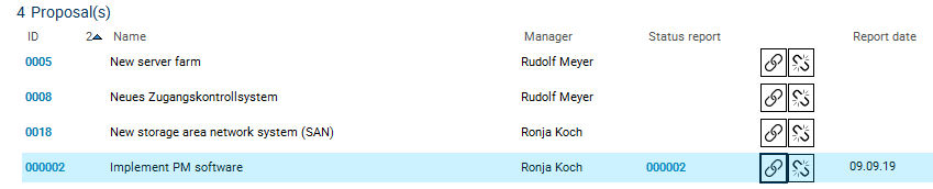 Wera Heine clicks on the link on the ID of the Implement PM software proposal to open the Proposal panel.