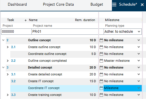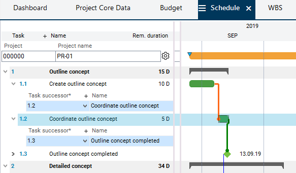 Enter the planned duration (e.g. 10 for 10 days) in the Remaining duration field in the Schedule module of the Create outline concept task.