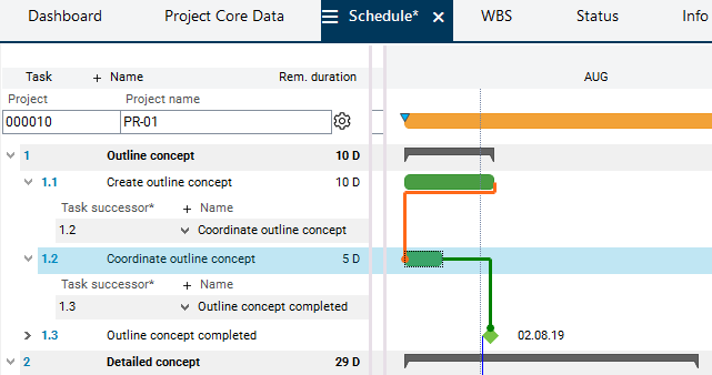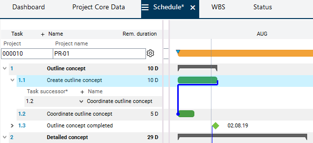 Step 2: Place the cursor at the end of the bar of the Create outline concept task. The mouse pointer becomes a cross. Drag the task to the beginning of the bar of the Coordinate outline concept task by holding down the left mouse button. As a result, a connection line between the two bars is displayed. As soon as the target bar is reached, the start position in the source bar and the target position in the target bar are marked by yellow arrows. Release the mouse button.