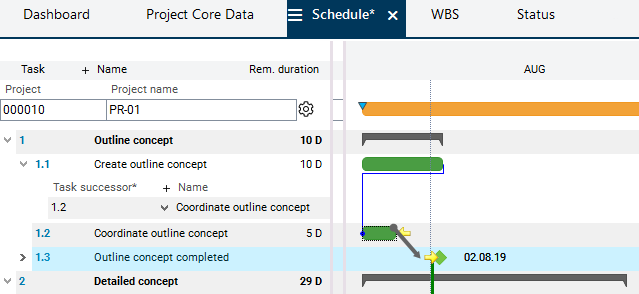 Calculate schedule button in the toolbar.Result: The beginning of the Coordinate outline concept task was postponed until after the end of the Create outline concept task. The duration of the Outline concept summary task has changed accordingly.