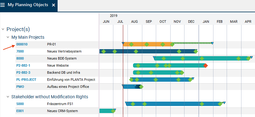 In this module, an overview of all planning objects of the project manager is displayed.