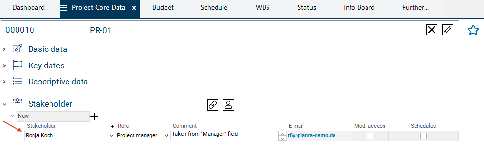 As a result, the new manager is set as a stakeholder in the Stakeholder area and multi-project manager is deleted as a stakeholder.