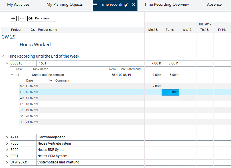 As a result, the planned value displayed in the Remaining field is reduced automatically so that you can quickly see how many of the planned hours still remain for the completion of the work.