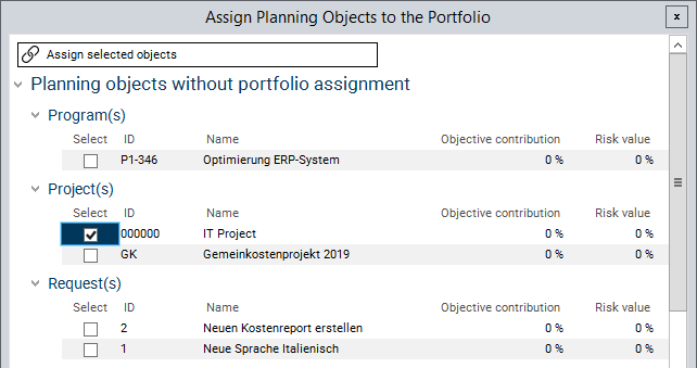 Activate the Select checkbox in the record of the new proposal in the Planning objects without portfolio assignment area and click on the Assign selected button.