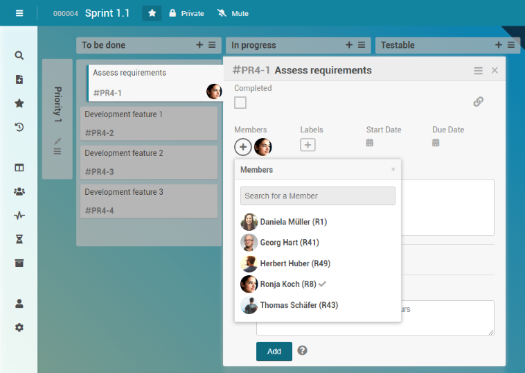 Georg Hart now wants to assign board members to the cards who are to be responsible for the completion of the respective tasks: