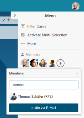 Thomas Schaefer is informed about the invitation via e-mail and his avatar is displayed in the Members section of the board.