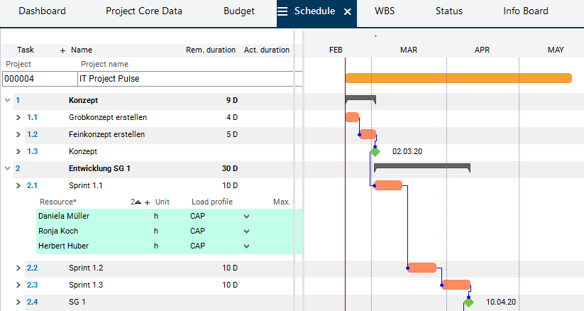 If hours worked are recorded in PLANTA pulse, the data is automatically synchronized with PLANTA project. There, load records are created in the respective project task for the corresponding resource assignments.