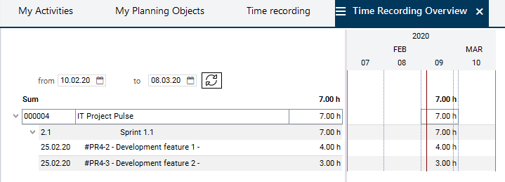 The hours recorded in PLANTA pulse are automatically adopted in the time recording modules of the corresponding employee in PLANTA project, e.g. in the Time Recording and Overview: Time Recording modules.