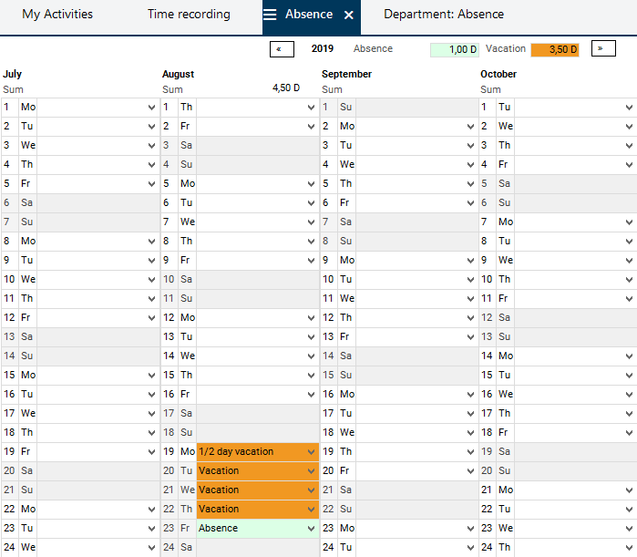 Furthermore, in the field directly below the weekday name, Daniela Mueller can tell by the color of the field whether she is on vacation or absent for another reason (orange = vacation, green = absence).